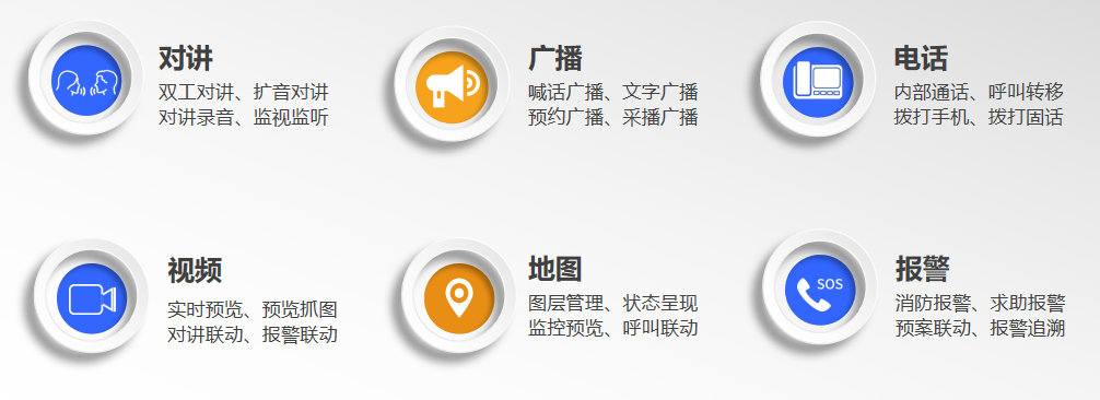 三、系統特性 開放性 系統以標準SIP協議為核心,支持第三方設備接入并與現有IP通信系統、IMS系統互聯互通,實現多系統融合;系統提供SDK開發接口,與第三方系統對接。 業務融合 單套系統集成了通信服務器、廣播服務器、錄音服務器、會商服務器、管理服務器等功能模塊;統一的控制臺操作界面,在一張電子地圖上可完成電話、對講、廣播、視頻、報警和遠程控制等操作。 高效協作 分布式部署,通過劃分多個分區并配置多個控制臺,單個控制臺可同時處理多個服務呼叫,并且支持控制臺之間的協作,提升監控中心服務效率。 高清音質 電信級的語音品質,系統支持國際標準G.722 寬頻語音編碼,結合特有的回聲消除技術,相比傳統PCMA編碼,堪稱高保真、高清晰音質。 四、系統功能